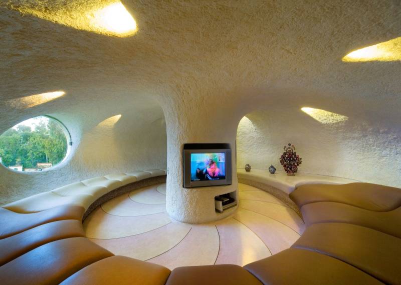 The house is put together using a frame of steel-reinforced chicken wire with a concrete spread over it, resulting an earthquake proof structure.